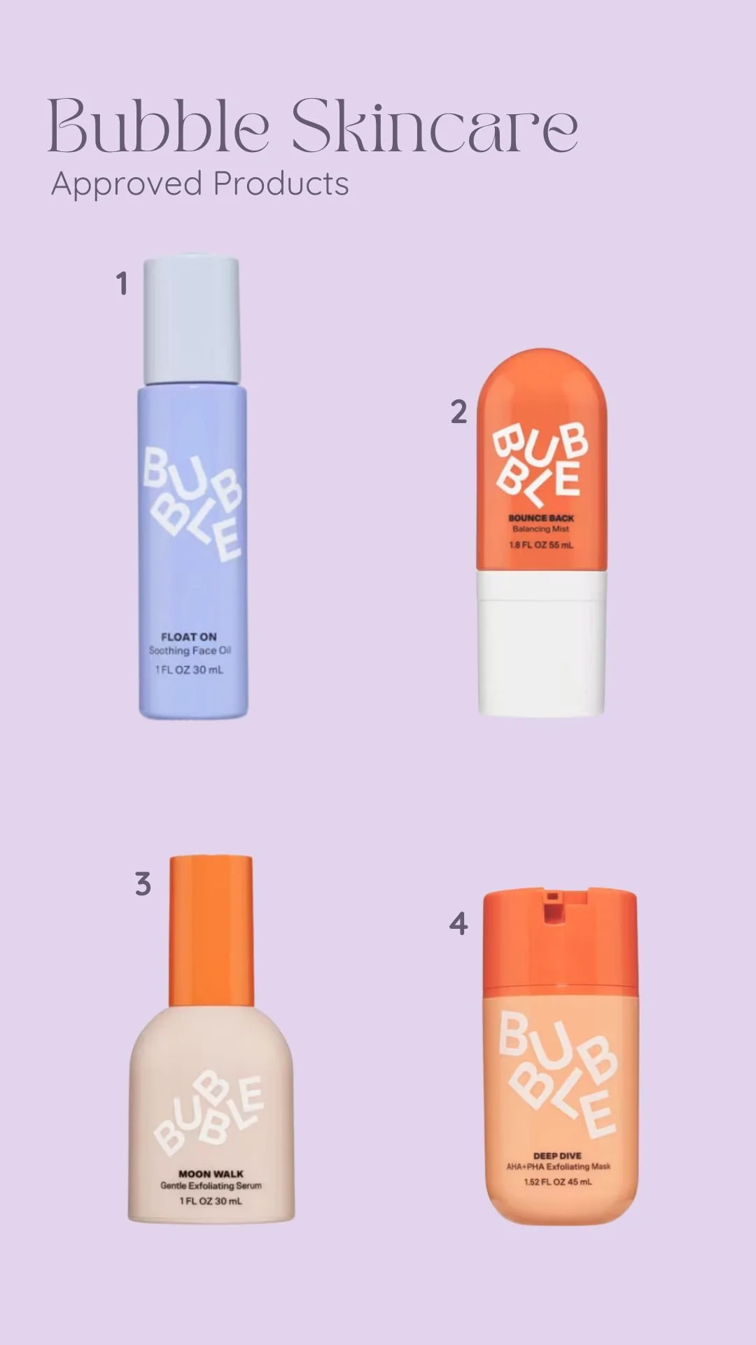 1: Float On Soothing Facial Oil 2: Bounce Back Balancing Toner Mist 3: Moon Walk Gentle Exfoliating Serum 4: Deep Dive AHA Exfoliating Mask