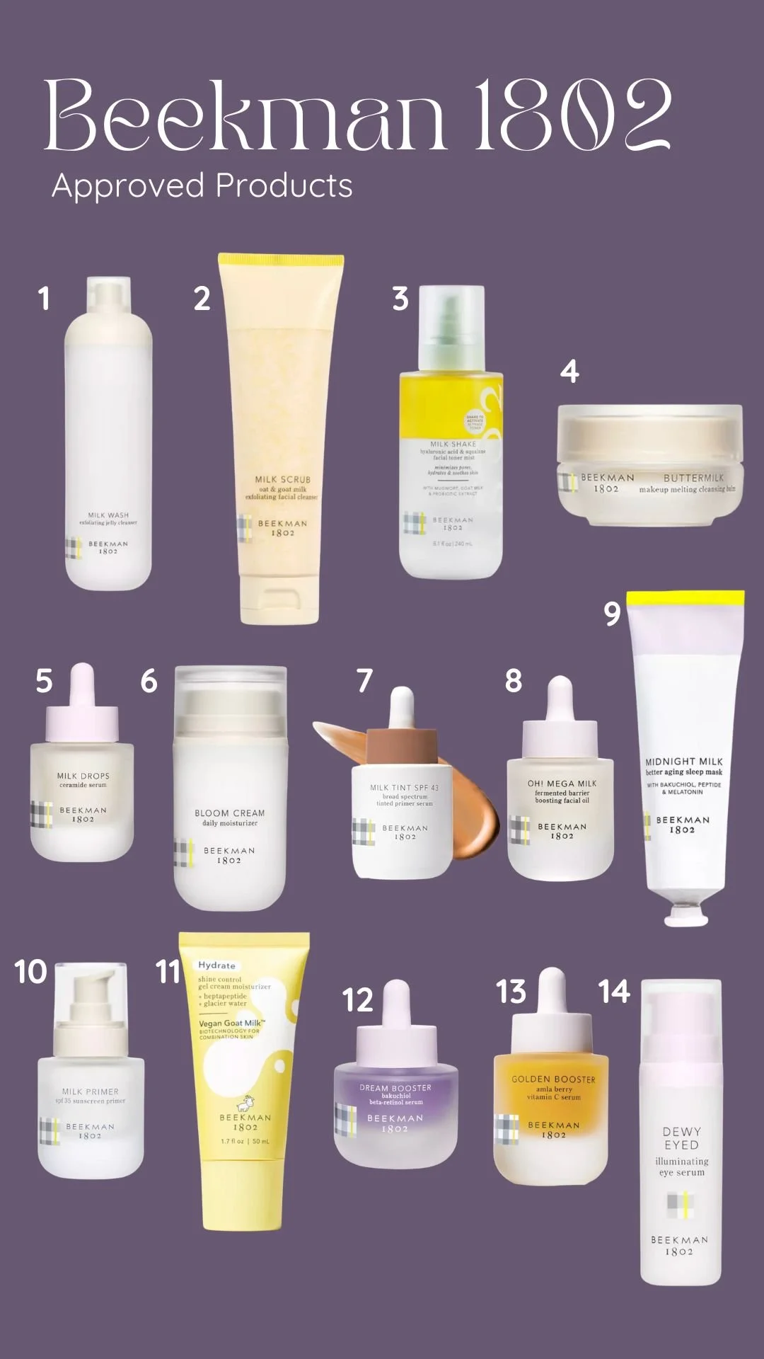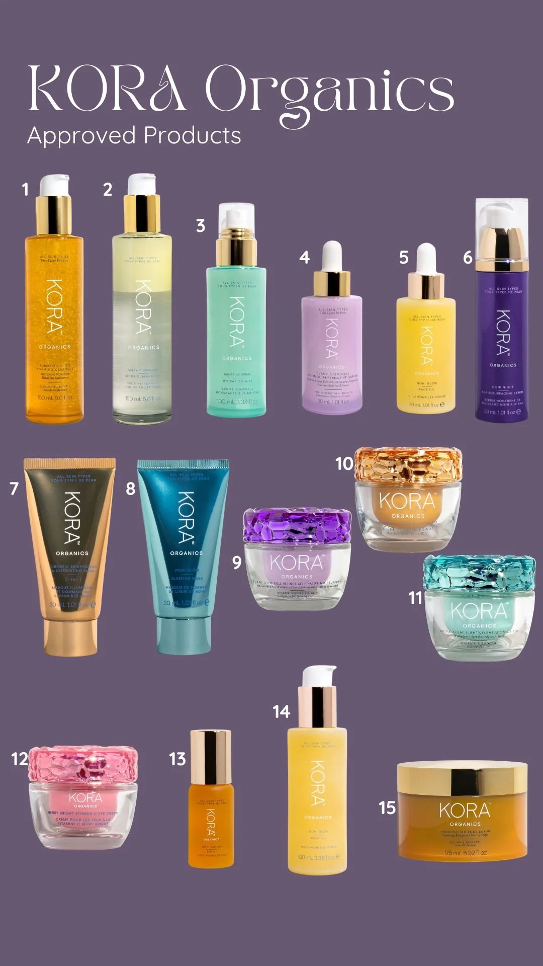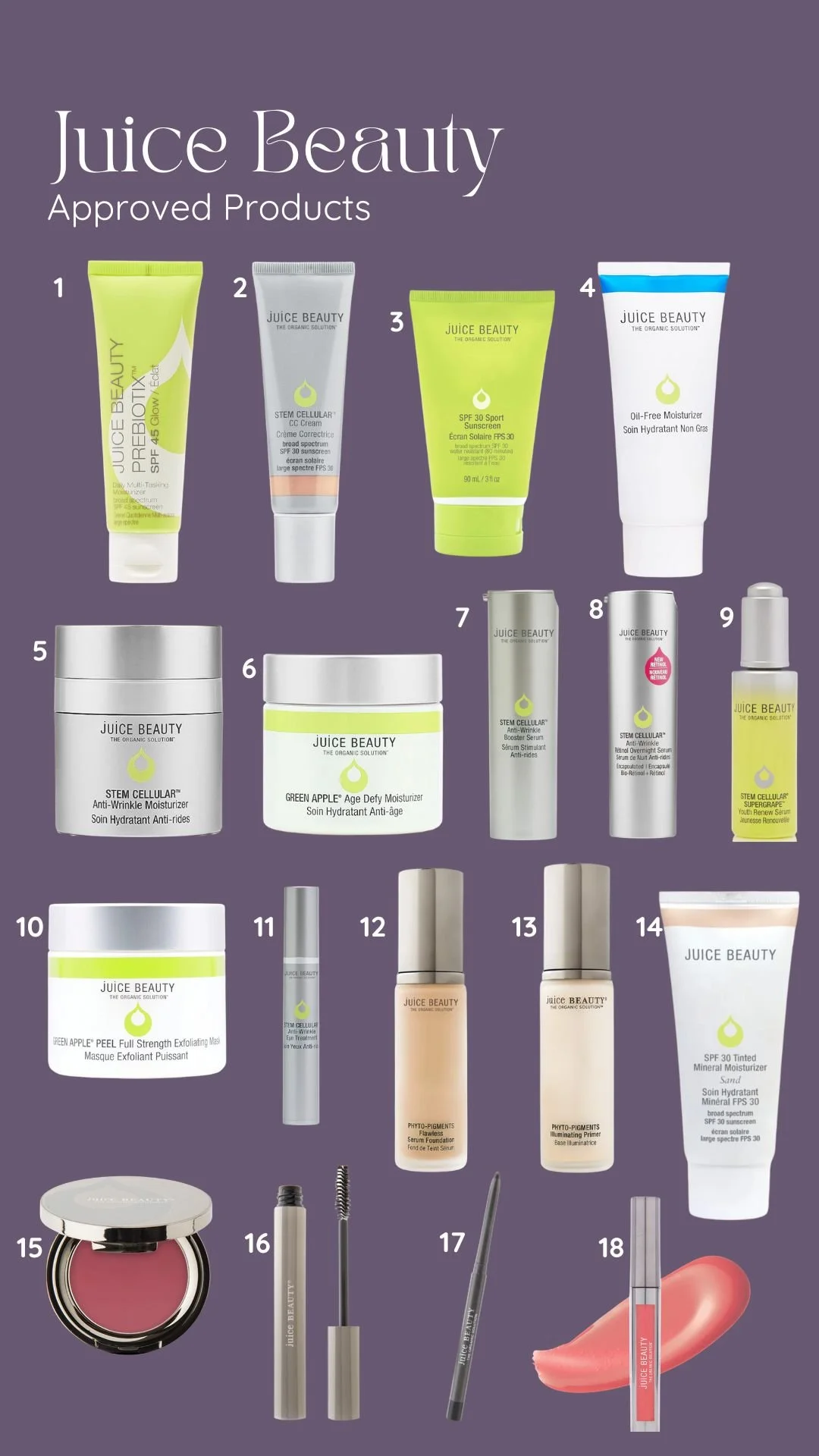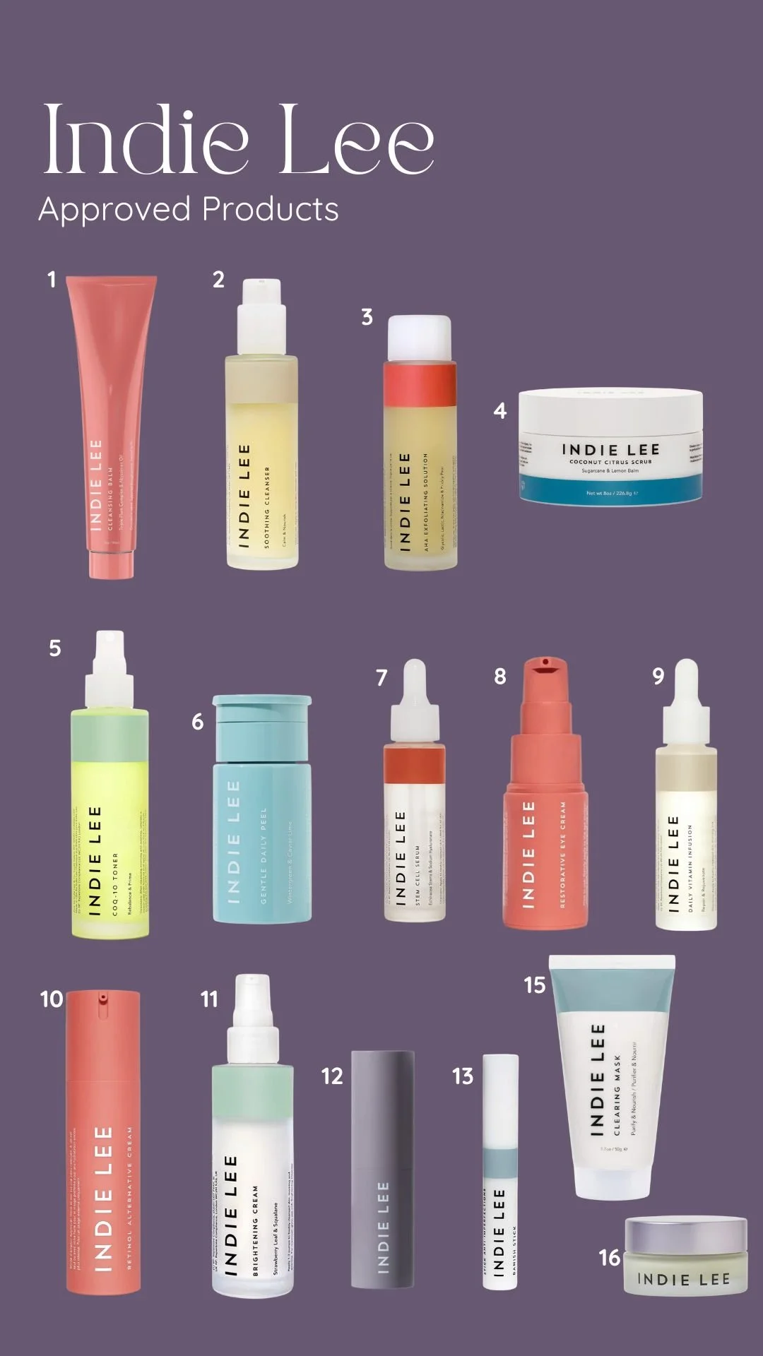 1: Cleansing Balm 2: Soothing Cleanser 3: AHA Exfoliating Toner 4: Citrus & Coconut Body Scrub 5: CoQ-10 Toner 6: Gentle Daily Peel 7: Stem Cell Serum 8: Restorative Eye Cream 9: Daily Vitamin Infusion 10: Retinol Alternative Cream 11: Brightening Cream 12: Hydrastick – Color Correcting & Highlighter Stick 13: Banish Stick 14: Clearing Mask 15: Color Balancer