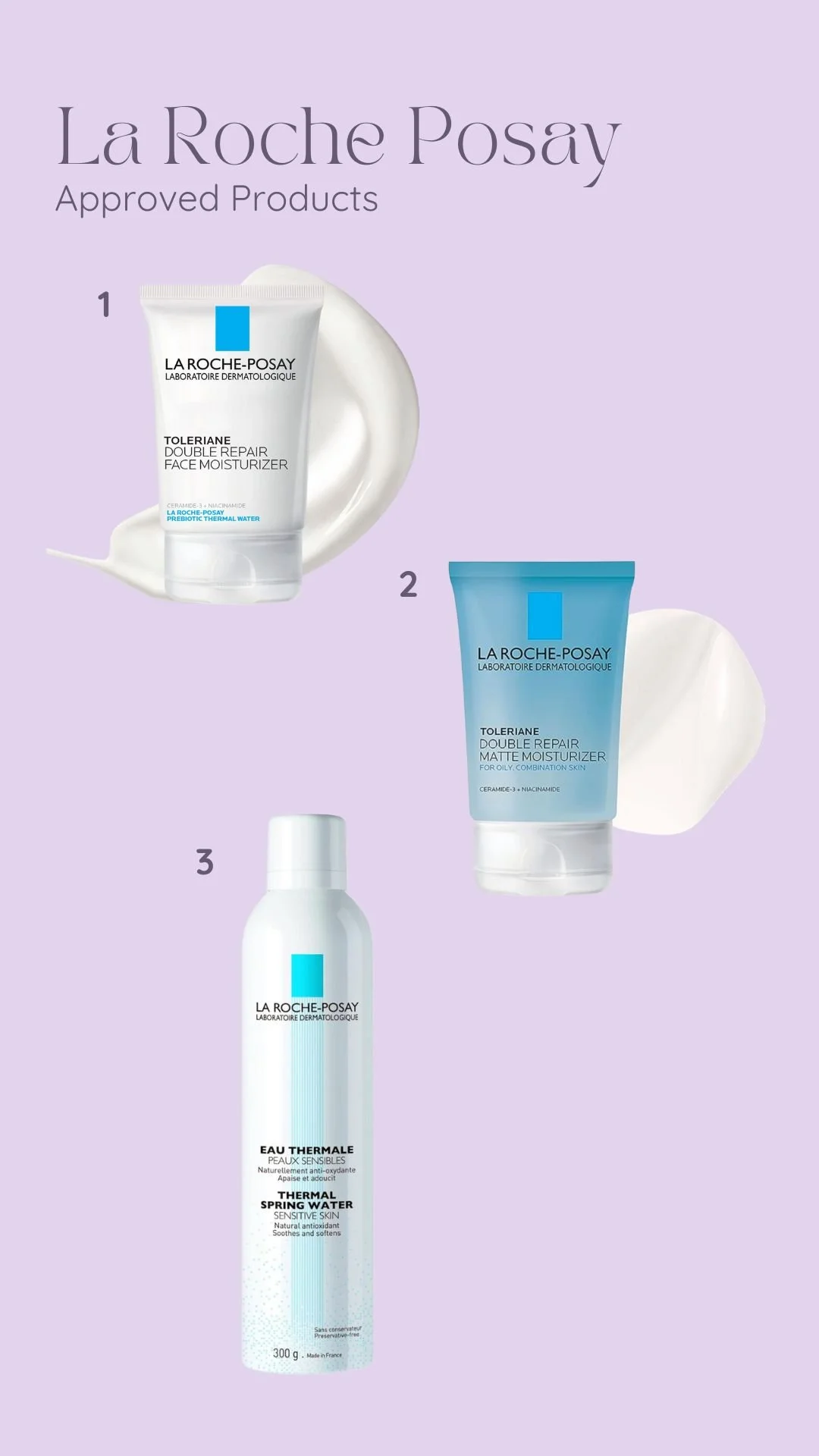 1: Toleriane Double Repair Face Moisturizer 2: Matte Face Moisturizer 3: La Roche-Posay Thermal Spring Water