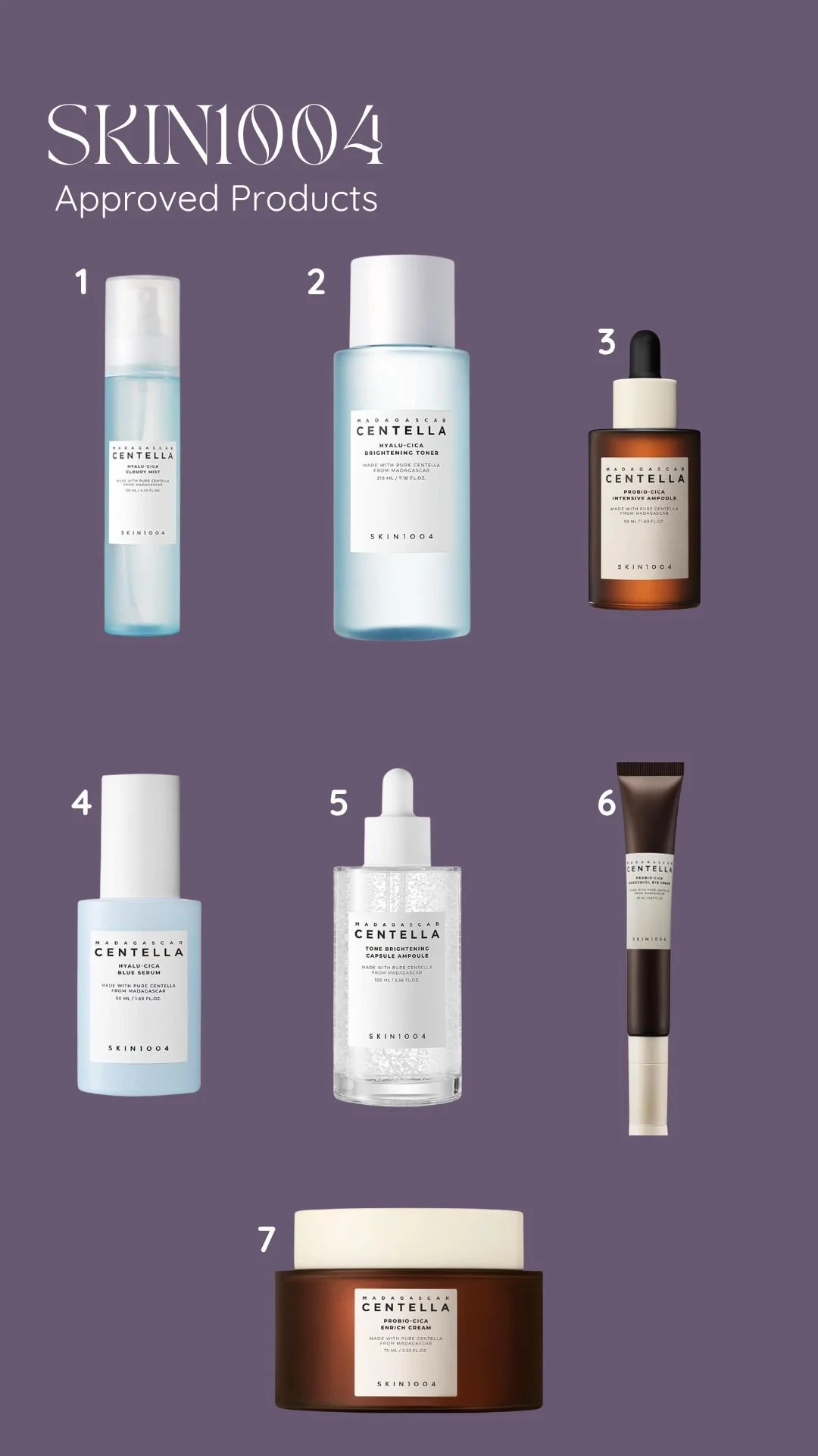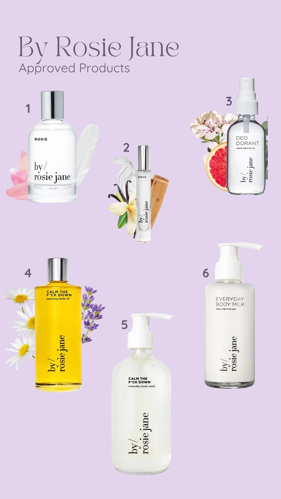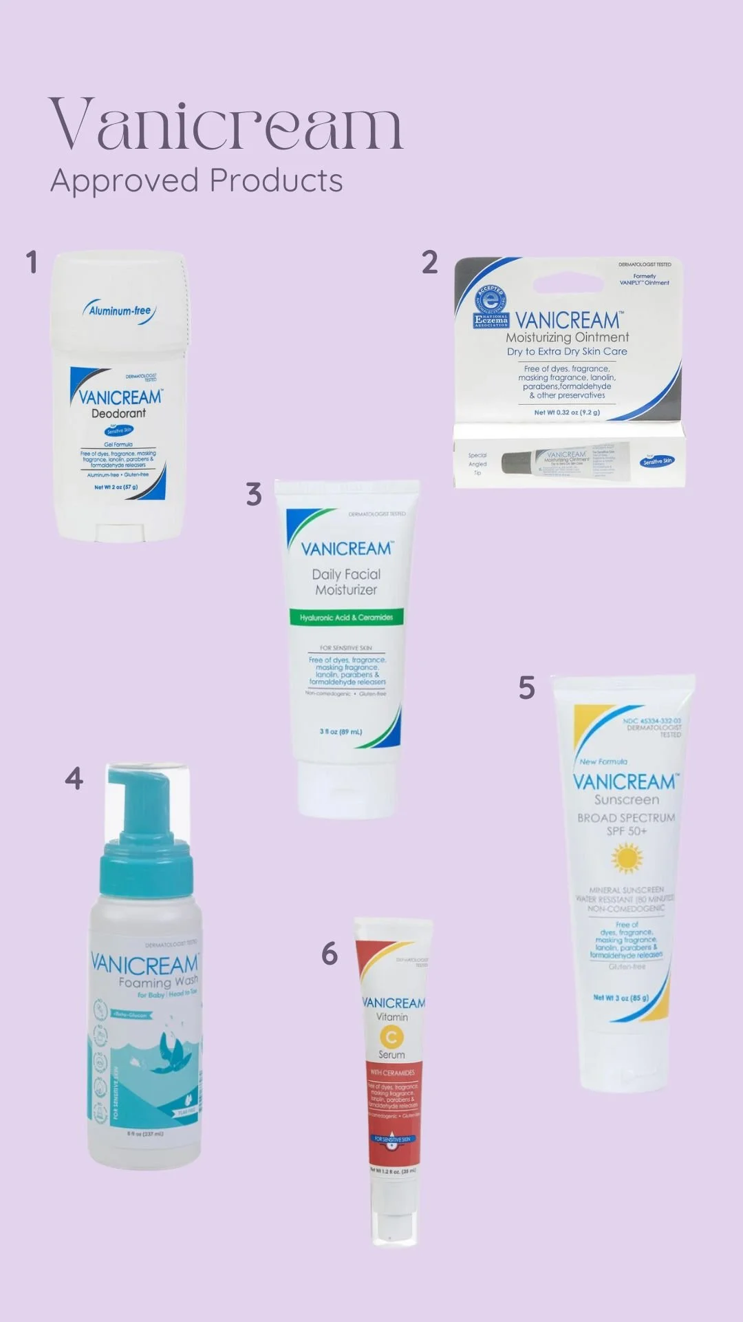 1: Deodorant 2: Moisturizing Oinment 3: Daily Facial Moisturizer 4: Foaming Baby Wash 5: Vitamin C Serum 6: Broad Spectrum SPF 50+
