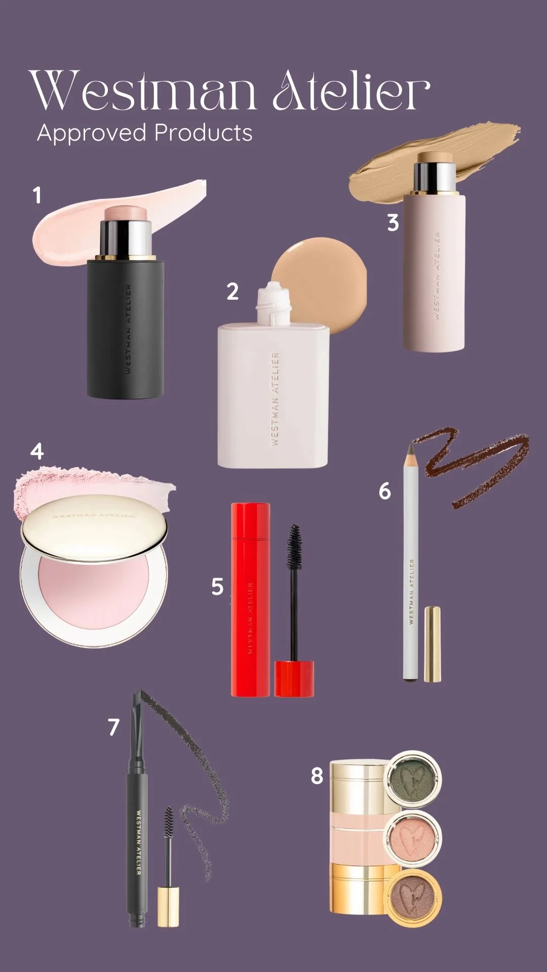 1: Tinted Eyebrow Growth Gel 2: Clear Eyebrow Growth Gel 3: Satin & Shimmer Powder Eyeshadow 4: Hydrating Cream Highlighter 5: Dewy Hydrating Concealer 6: Hydrating Non-Comedogenic Foundation 7: Skin Tint Serum Foundation 8: Cream Bronzer