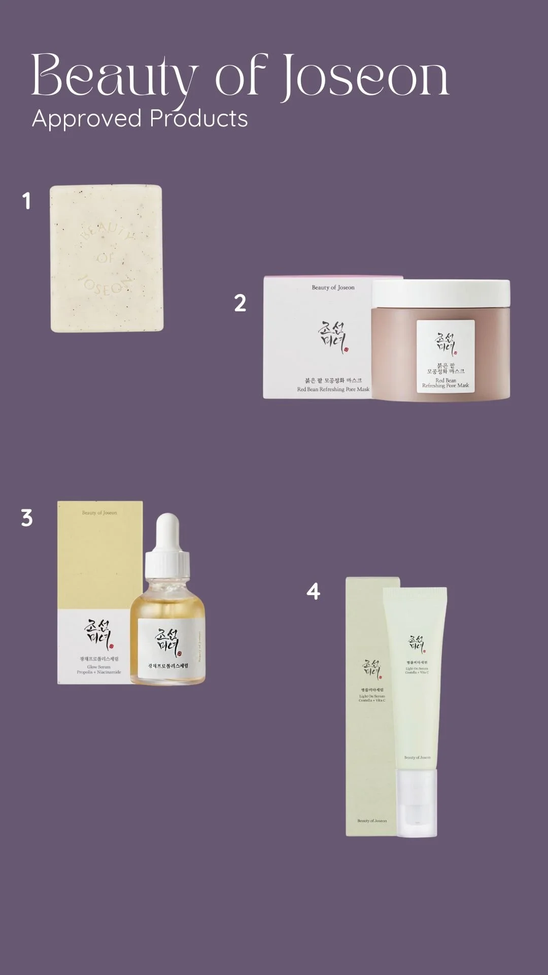 1: Beauty of Joseon Low pH Rice Face and Body Cleansing Bar 2: Beauty of Joseon Red Bean Refreshing Pore Mask 3: Beauty of Joseon Glow Serum 4: Light on Serum Vitamin C