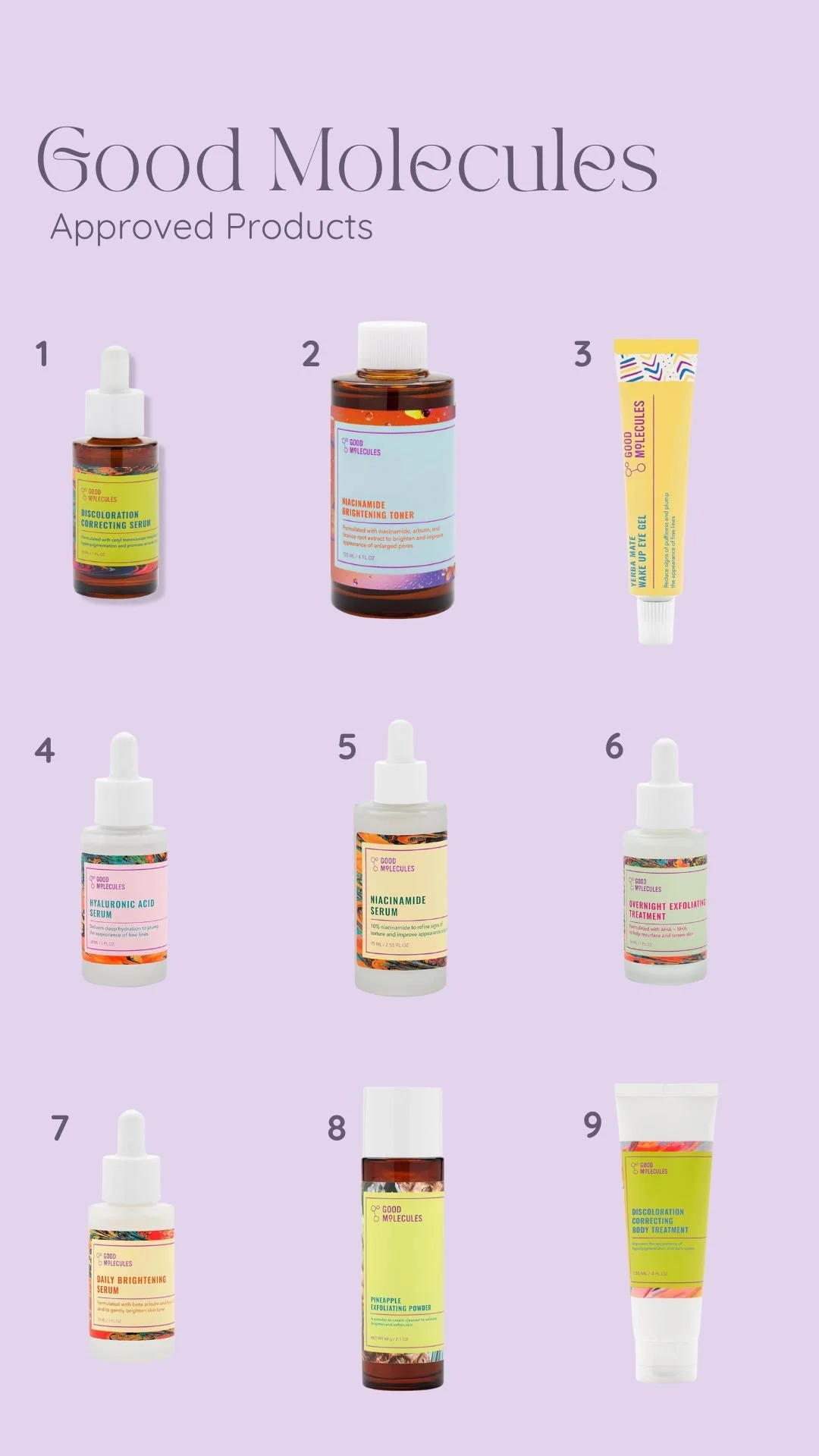 1: Discoloration Correcting Serum 2: Niacinamide Brightening Toner 3: Yerba Mate Wake Up Eye Gel 4: Hyaluronic Acid Serum 5: Niacinamide Serum 6: Overnight Exfoliating Treatment 7: Daily Brightening Serum 8: Pineapple Exfoliating Powder 9: Discoloration Correcting Body Treatment