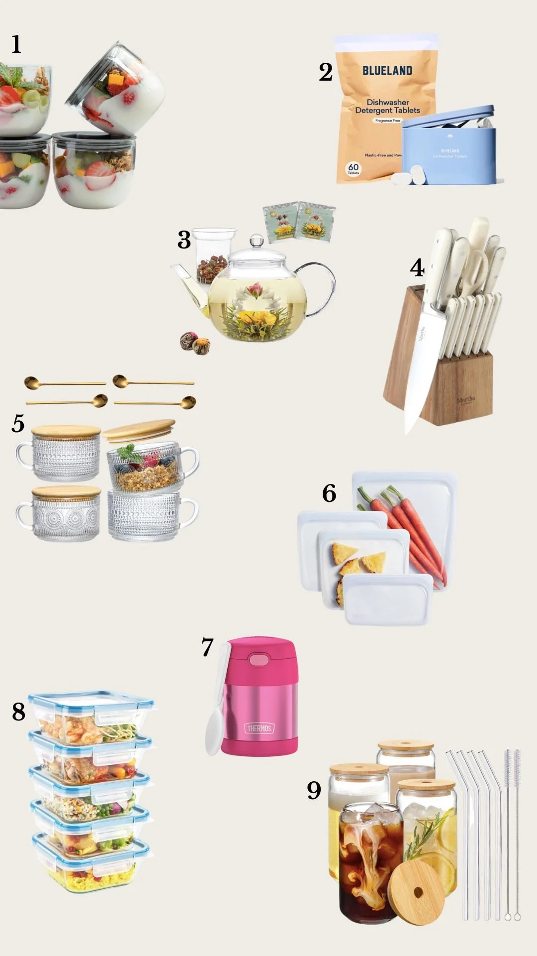1: S’well Prep Food Glass Bowls – Set of 4 2: Blueland Dishwasher Tablets 3: Glass Tea Pot 4: Martha Stewart Stainless Steel Knife Set 5: Glass Mugs w/ Bamboo Lid 6: Stasher Reusable Silicone Storage Bags 4-pack 7: Kids Thermos 8: Glass Food Storage Contain 5 Piece 9: Glass Tumblers w/ Bamboo Lid