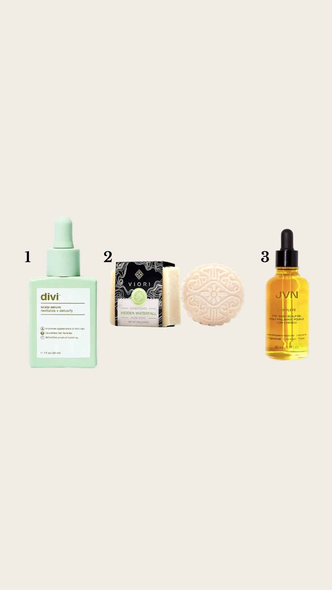 1: Divi Scalp Serum 2: Viori Shampoo and Conditioner Bars 3: JVN Pre-Wash Scalp Oil & Hair Treatment Oil