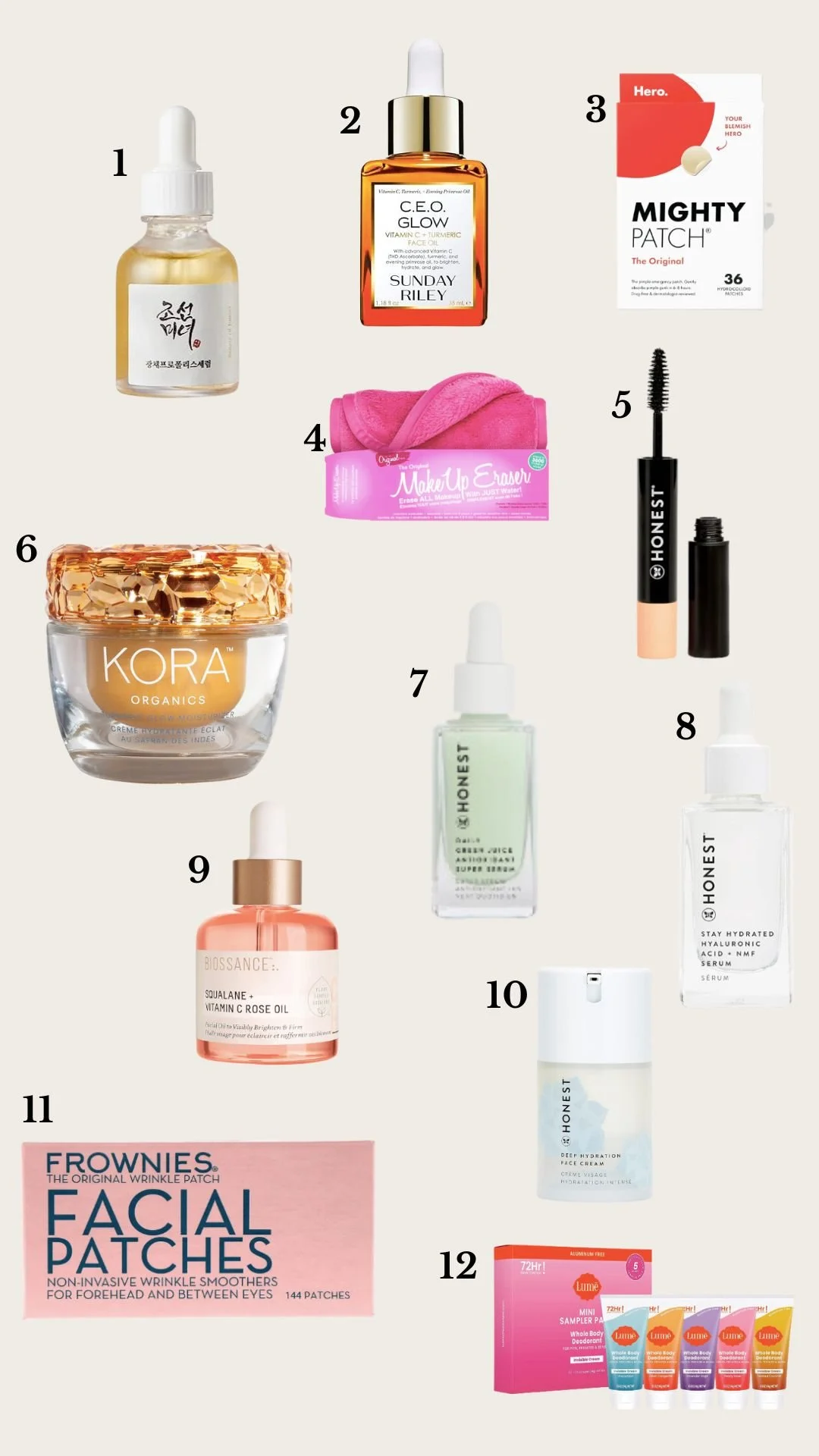 1: Beauty of Joseon Serum Line Glow Serum 2: Sunday Riley C.E.O Glow Vitamin C & Turmeric Face Oil 3: Hero Pimple Patch 4: Makeup Eraser 5: Honest 2-in-1 Extreme Volume Mascara 6: Kora Organic Tumeric Glow Moisturizer 7: Honest Beauty Daily Green Juice Antioxidant Super Serum 8: Honest Beauty Stay Hydrated Hyaluronic Acid + NMF Serum 9: BIOSSANCE Squalane and Vitamin C Rose Oil 10: Honest Deep Hydration Face Cream 11: Frownies Wrinkle Patch 12: Lume Whole Body Deodorant Sample Pack