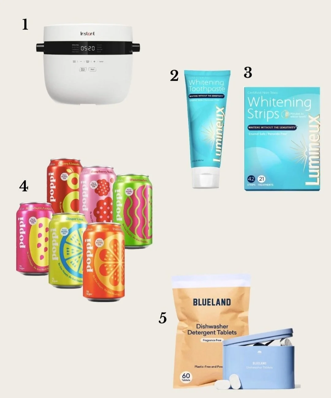 1: Instant Pot Rice Cooker 2: Lumineux Whitening Toothpaste 3: Lumineux Whitening Strips 4: Poppi Variety Pack 5: Blueland Dishwasher Detergent Tablets