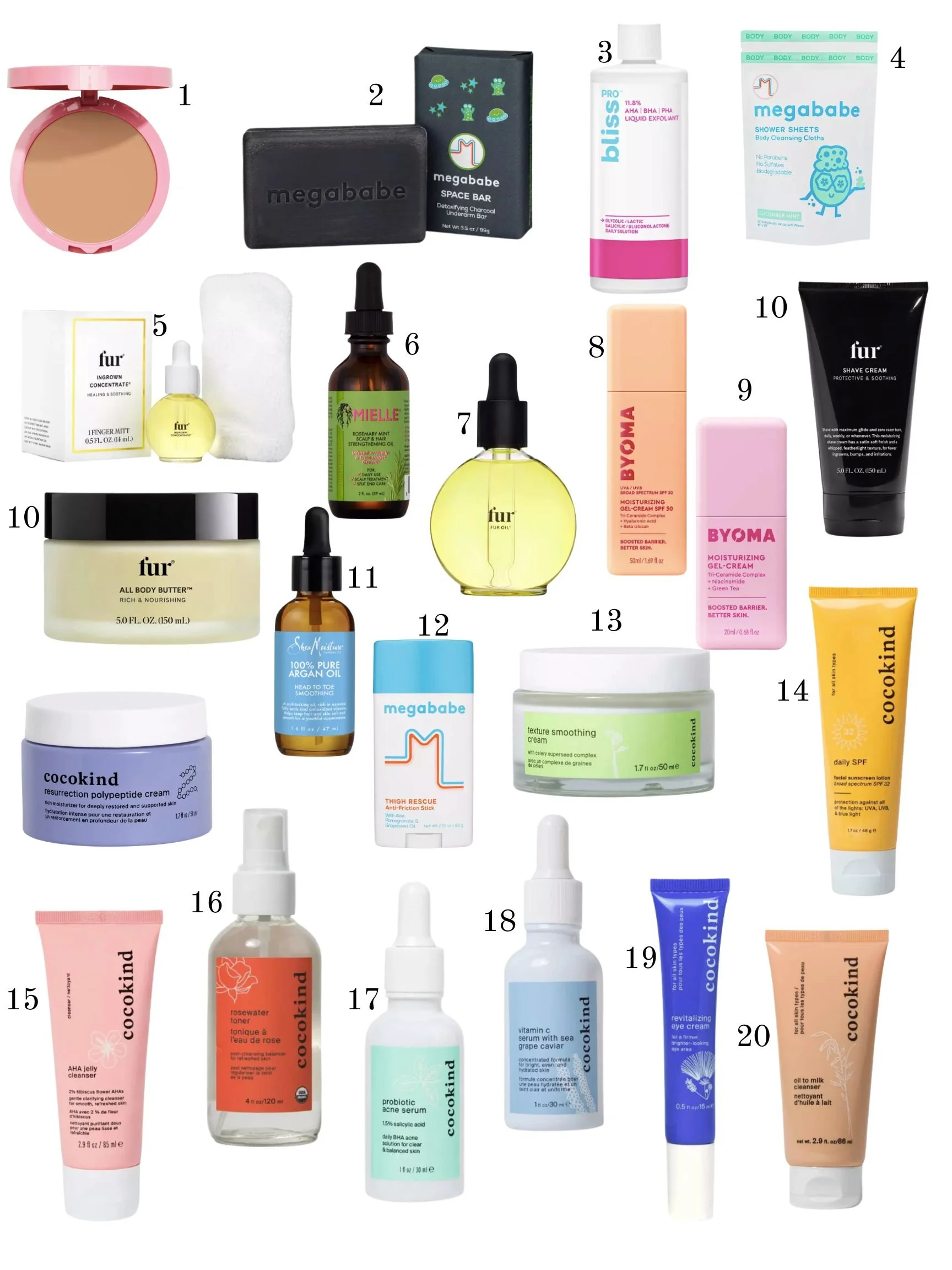 1: Covergirl Clean Fresh Powder | 2: Megababe Space Bar Detoxifying Charcoal Underarm Bar | 3: BlissPro 11.8% AHA | BHA | PHA Liquid Exfoliant | 4: Megababe Cucumber Mint Shower Sheets | 5: Fur Ingrown Concentrate | 6: Mielle Rosemary Mint Scalp & Hair Strengthening Oil | 7: Fur Oil | 8: Byoma Moisturizing Gel Cream SPF30 | 9: Byoma Moisturizing Gel Cream | 10: Fur Body Butter | 11: Shea Moisture 100% Pure Argan Oil | 12: Megababe Thigh Rescue | 13: Cocokind Texture Smoothing Cream | 14: Cocokind SPF 32 | 15: Cocokind AHA Jelly Cleanser | 16: Cocokind Rosewater Toner | 17: Cocokind Probiotic Acne Serum | 18: Cocokind Vitamin C Serum| 19: Cocokind Eye Cream | 20: Cocokind Oil To Milk Cleanser