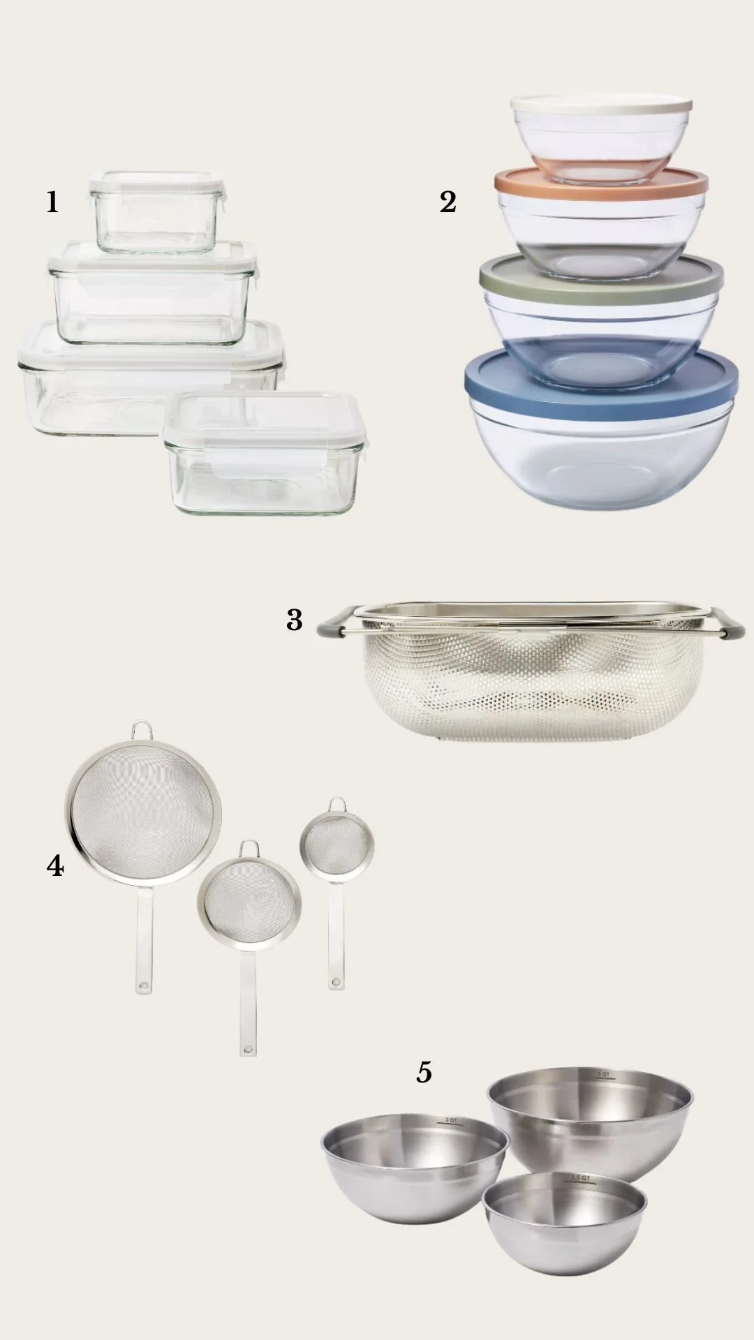 1: 8pc (Set of 4) Glass Food Storage Container Set Clear 2: Glass Set of 4 Mixing Bowls with Lids Clear 3: 7qt Stainless Steel Expandable Over the Sink Mesh Colander Silver 4: 3pc (3″, 5″, and 8″) Stainless Steel Mesh Strainer Set Silver 5: Glass Set of 4 Mixing Bowls with Lids Clear