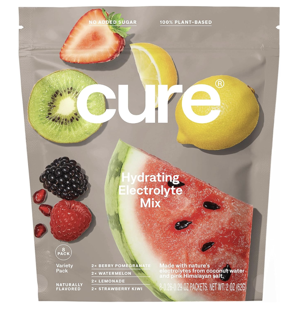 Chances are, if you’re just drinking water, it’s not hydrating you enough. Adding a little bit of salt to your water daily can help, but drinking electrolytes is also a great idea. I’ve tried a bunch of different electrolytes and I like Cure because they don’t taste super salty like other brands. The ingredients are great, and you’re not getting all the crap that they add to other popular electrolyte brands.