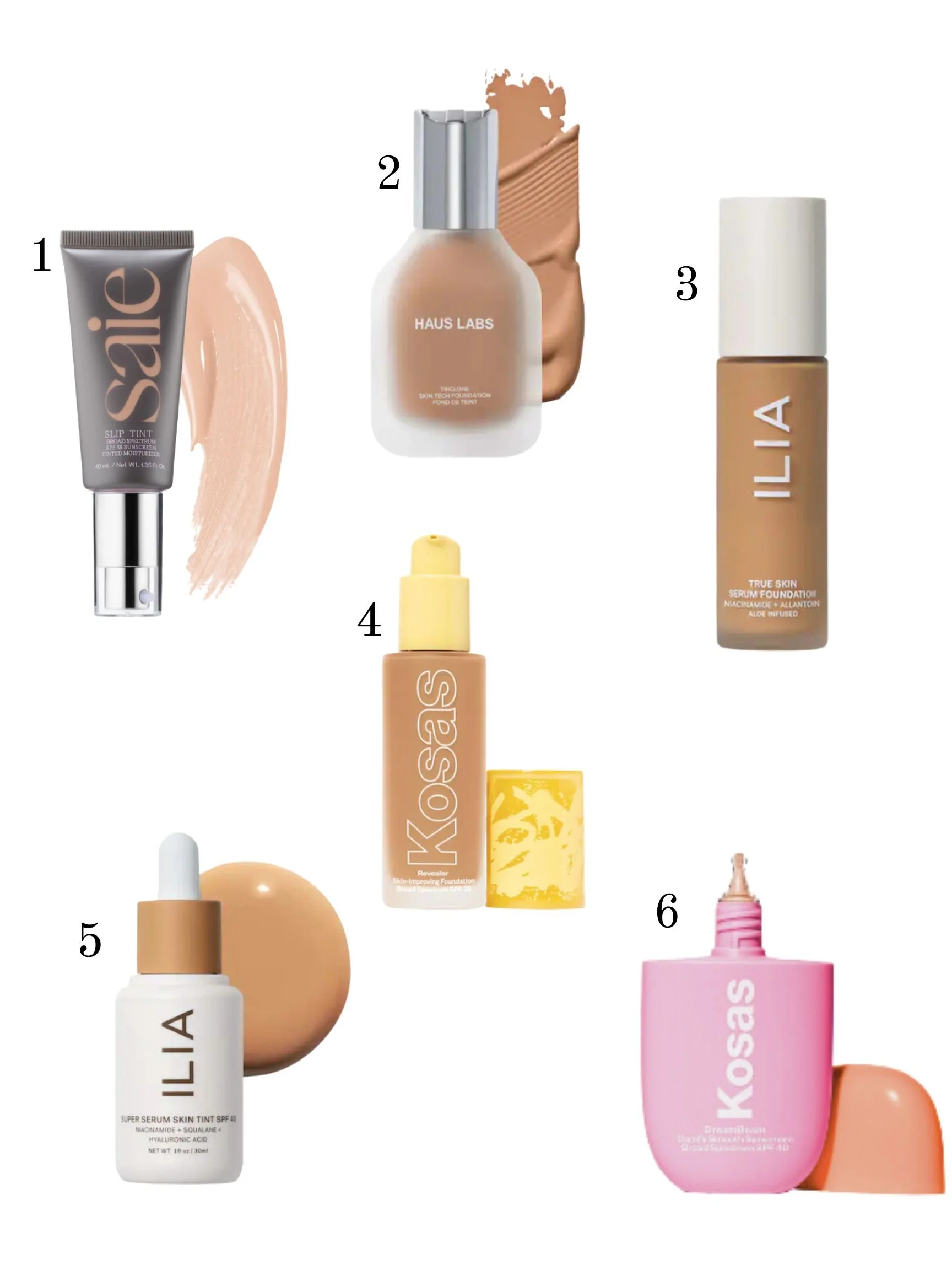 1: Saie Slip Tint 2: Haus Labs Foundation 3: Ilia Foundation 4: Kosas Foundation 5: Ilia Super Serum Skin Tint 6: Kosas Dream Beam