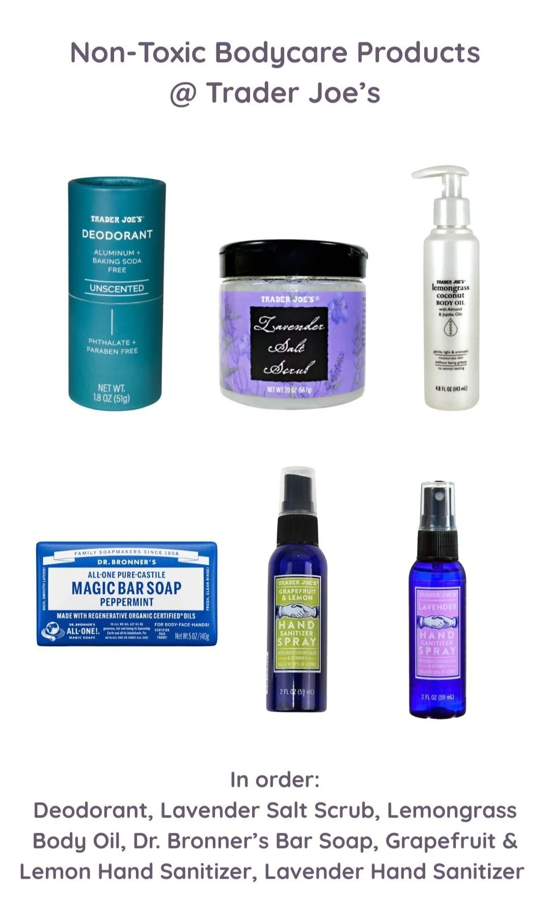 I went into Trader Joe’s and reviewed alll the ingredients in the skincare, haircare, body care and cleaning products! Below are the completely non-toxic products available at Trader Joe’s. Download this free list to find out what toxic Ingredients to Avoid.